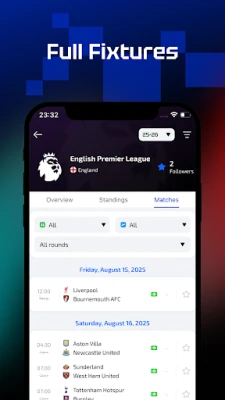 Uanset din passion tilbyder AiScore en imponerende dybde: over 2.600 fodboldkampe, 500 basketballturneringer, samt komplet dækning af tennis og snooker, alt sammen med de seneste ranglister og spillerstatistikker fra mere end 200 lande. Men oplevelsen stopper ikke ved tallene – træd ind i vores interaktive chatrum, hvor du kan forbinde med andre sportsfans fra alle verdenshjørner. Del din begejstring, dine analyser og diskussioner i realtid, og gør enhver kamp til en fælles oplevelse. AiScore forstår din sport, uanset hvor eller hvordan du følger med.
