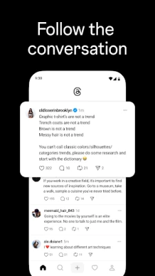 Threads er din nye destination for engagerende samtaler og levende fællesskaber. Her kan du dykke ned i emner, der optager dig lige nu, og udforske morgendagens trends. Uanset om din passion er film, sport, kunst eller videnskab, giver Threads dig mulighed for at knytte bånd direkte til dine yndlingsskabere og andre med samme interesser. Opbyg dit eget loyale publikum, del dine tanker, meninger og kreative indspark med verden, og bliv en del af en global dialog.
